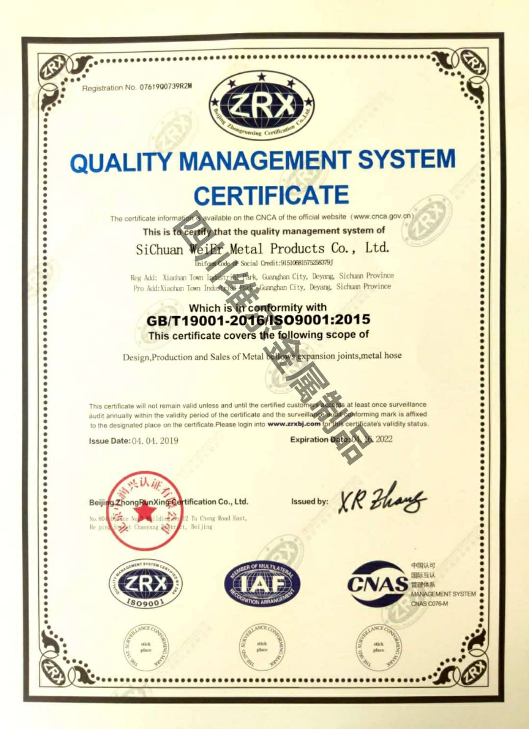 质量管理体系认证证书