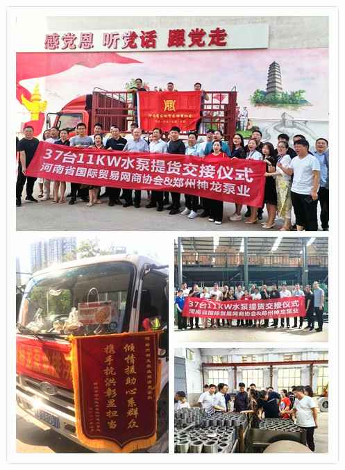 河南国际贸易网商协会、青岛远航农业产品批发有限公司水泵提货交接,未来路街道赠神龙排涝突击队锦旗